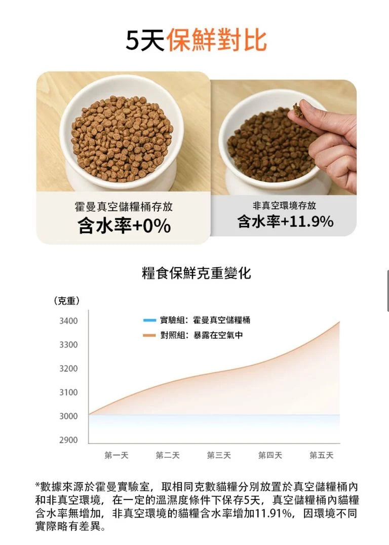 This design effectively prevents moisture, spoilage, and nutrient loss. A 5-day freshness comparison test showed that food stored in the vacuum-sealed container maintained its moisture level, while food in a non-vacuum environment increased in moisture by 11.9%.