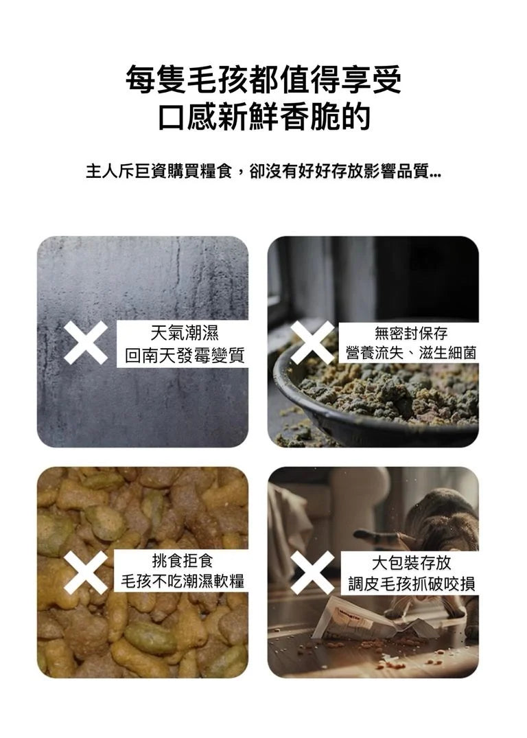 Can store pet food, freeze-dried items, grains, snacks, etc.