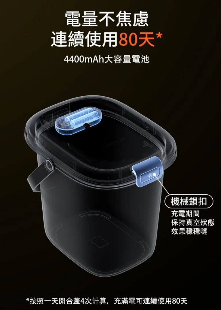 Built-in 4400mAh high-capacity battery. Assuming 4 lid openings per day, a full charge can last up to 80 days! The battery is removable for easy, separate charging. -